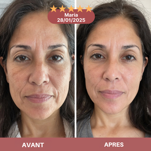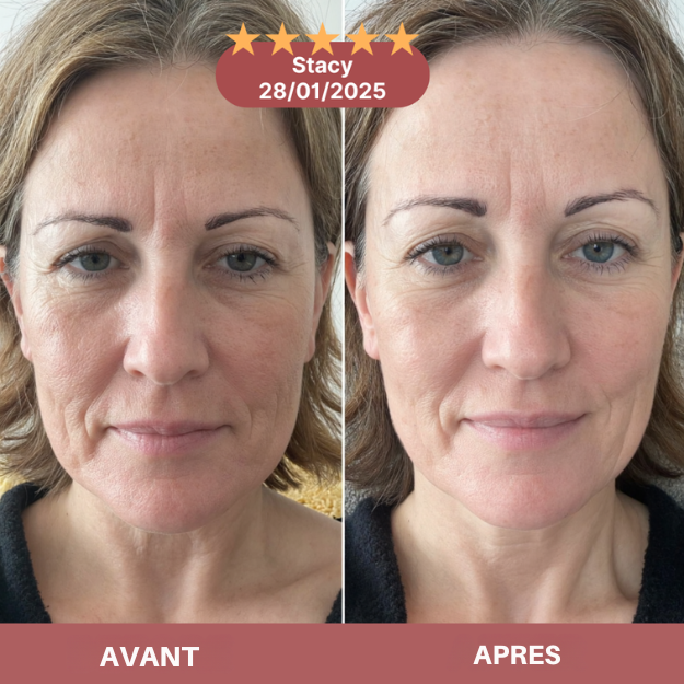 Les rides et le relâchement disparaissent progressivement, révélant une peau plus ferme, liftée et éclatante, avec une luminosité jeune et naturelle.