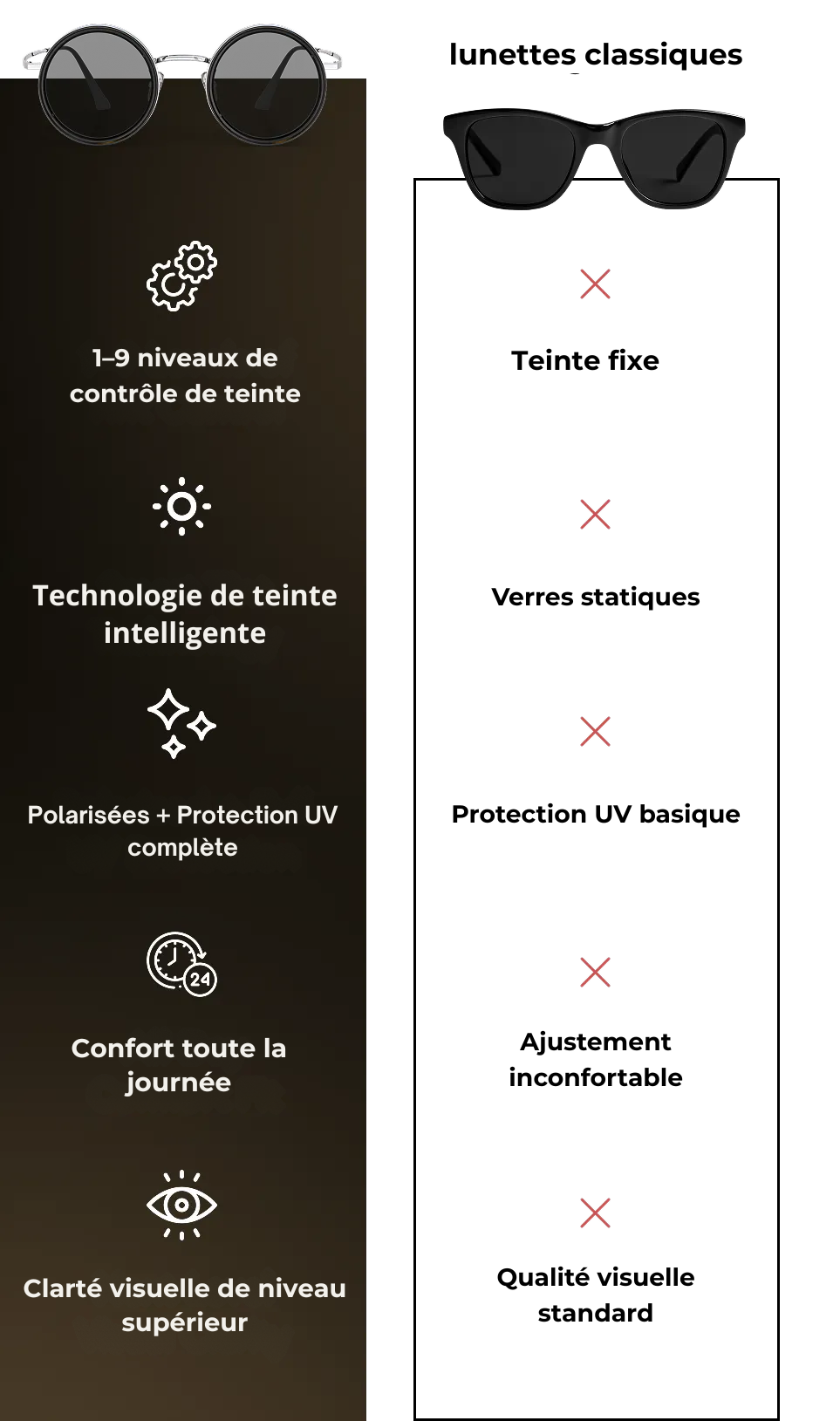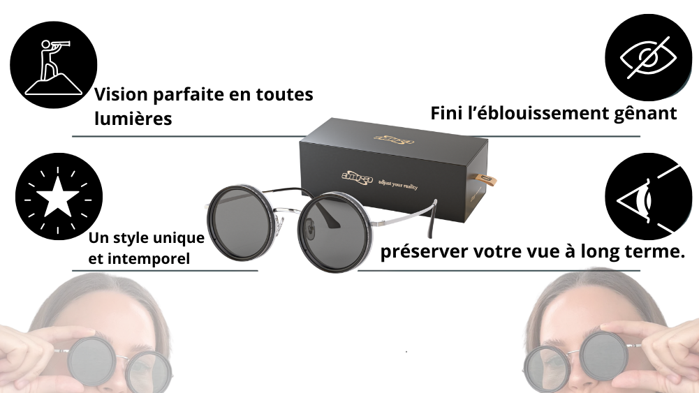 Verres polarisés à teinte réglable qui s’adaptent à la lumière et à ton style.