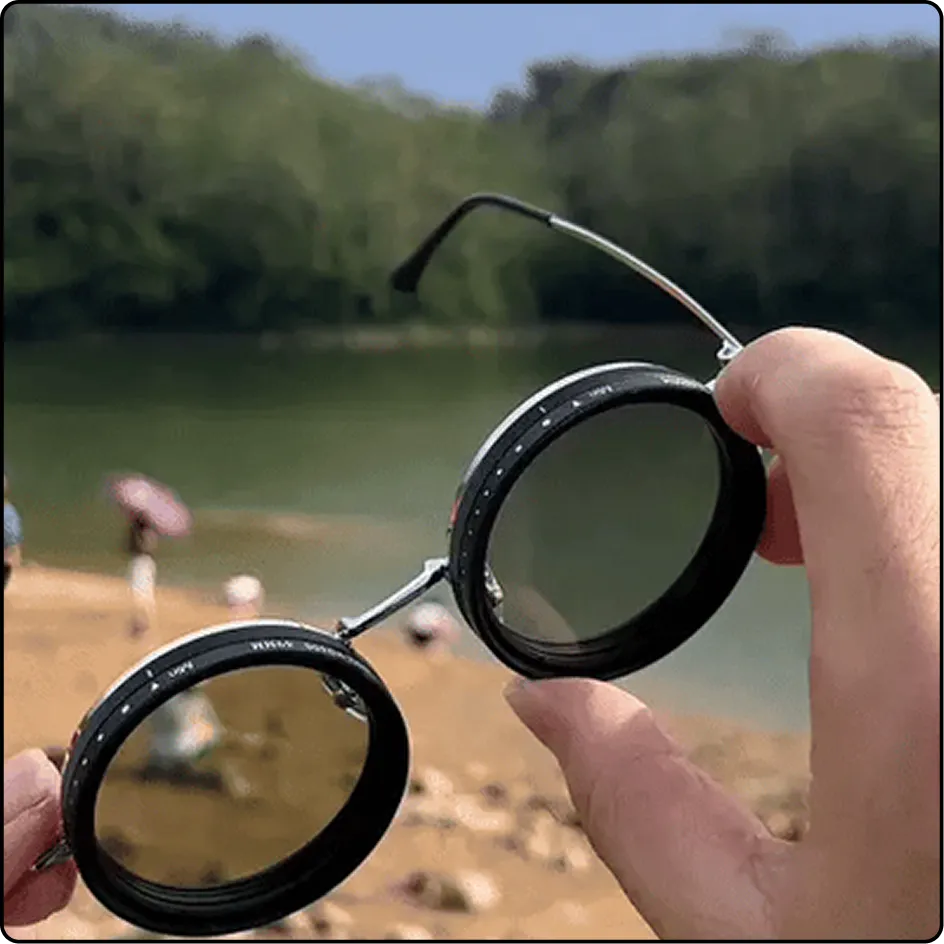 Nos lunettes sont équipées d’un filtre à densité neutre (ND) réglable intégré, similaire à ceux utilisés en photographie professionnelle. Il suffit de tourner la molette sur l’objectif pour ajuster le niveau de teinte et contrôler la luminosité sans changer de lunettes.
