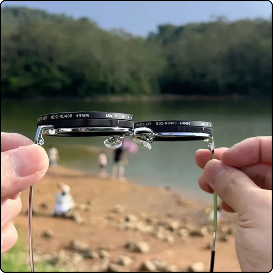 Nos lunettes sont équipées d’un filtre de densité neutre (ND) ajustable intégré, similaire à ceux utilisés en photographie professionnelle.